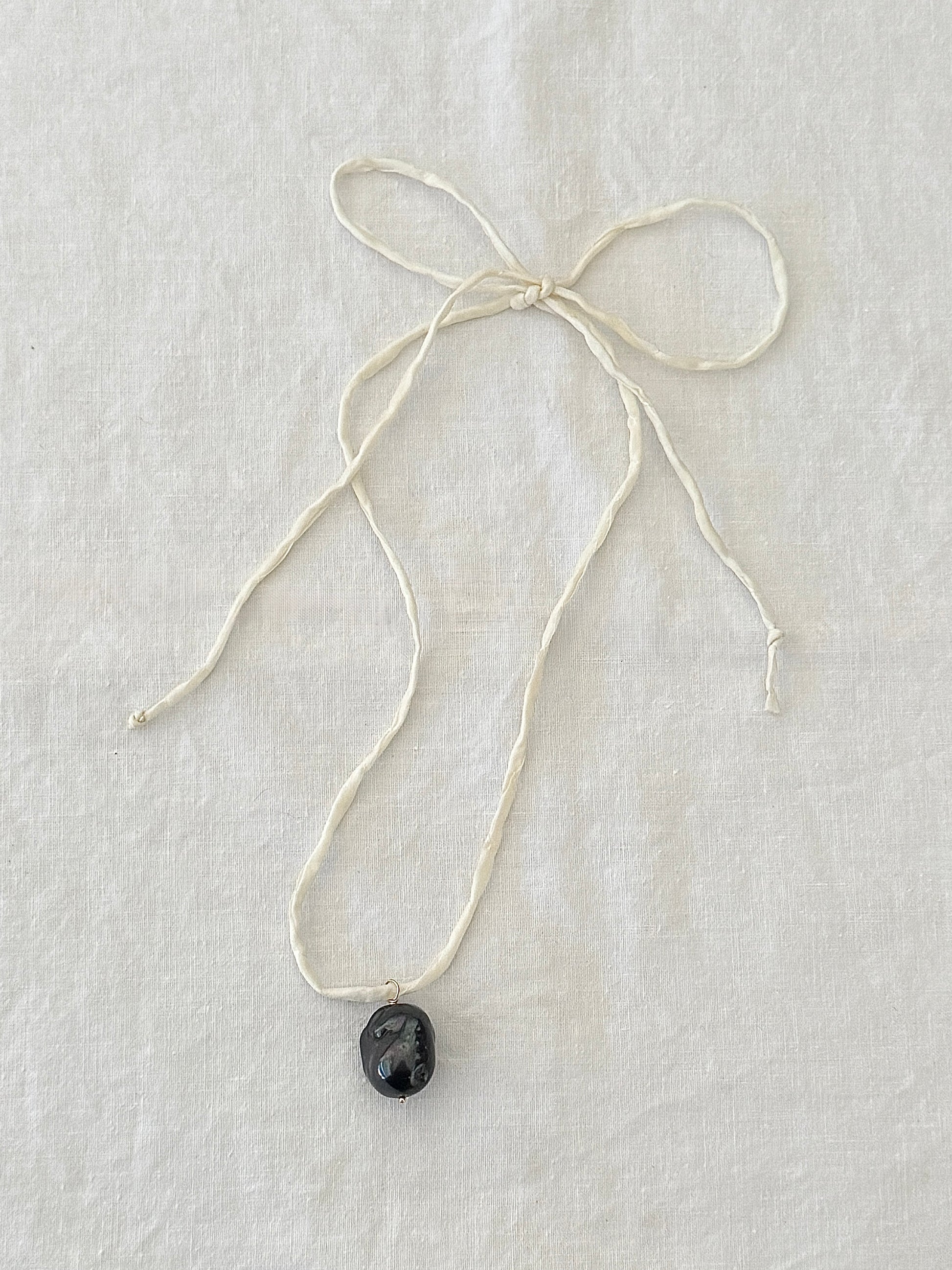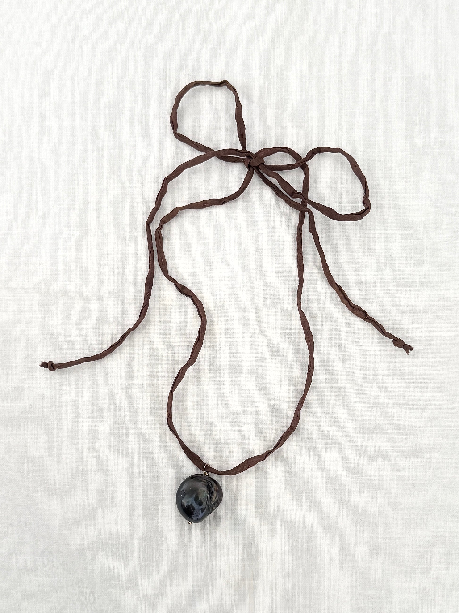 A baroque pearl on a 100% silk cord, handcrafted in a few variations. Wear it around your neck, braided in your hair or around your waist. A timeless adornment.